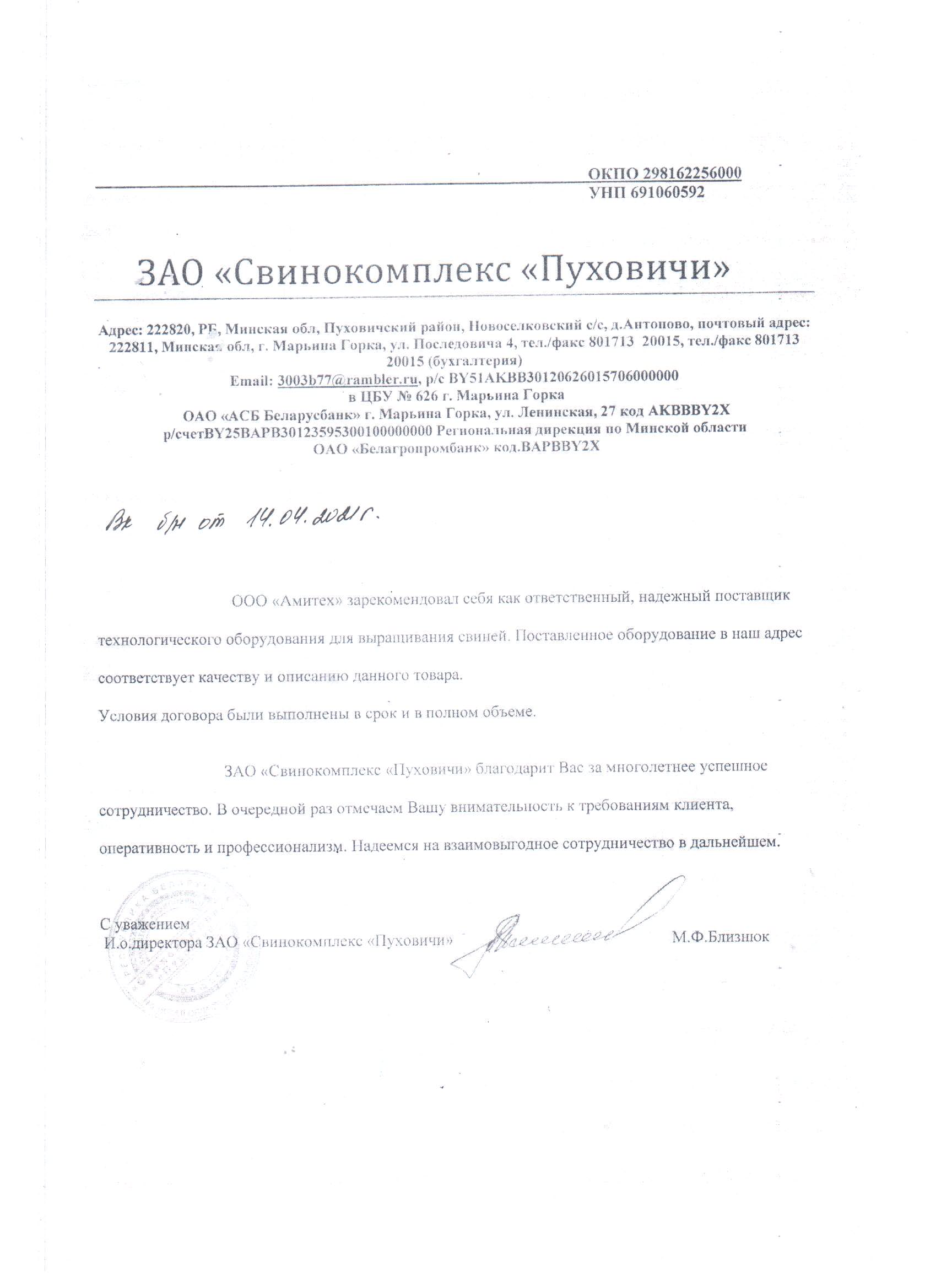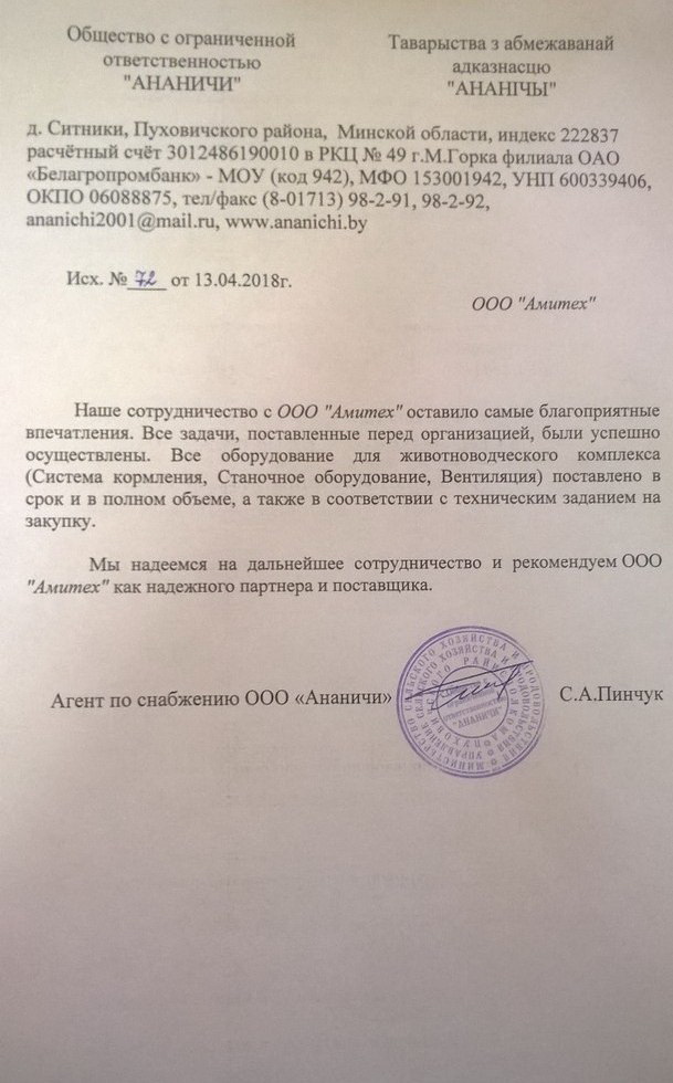Настоящим письмом ОАО «Беловежский» выражает благодарность ООО «Амитех» за своевременную поставку станочного оборудования, системы кормления и прочего оборудования для животноводческого комплекса. За все время работы компания зарекомендовала себя как профессиональный и надежный партнер и выполнила все взявшие на себя обязательства в полном объеме. Все оборудование соответствует предоставленному описанию и техническим требованиям Республики Беларусь. Исходя из всего вышесказанного хотим отметить высокий профессионализм всех сотрудников ООО «Амитех» и нацелены на дальнейшее сотрудничество.