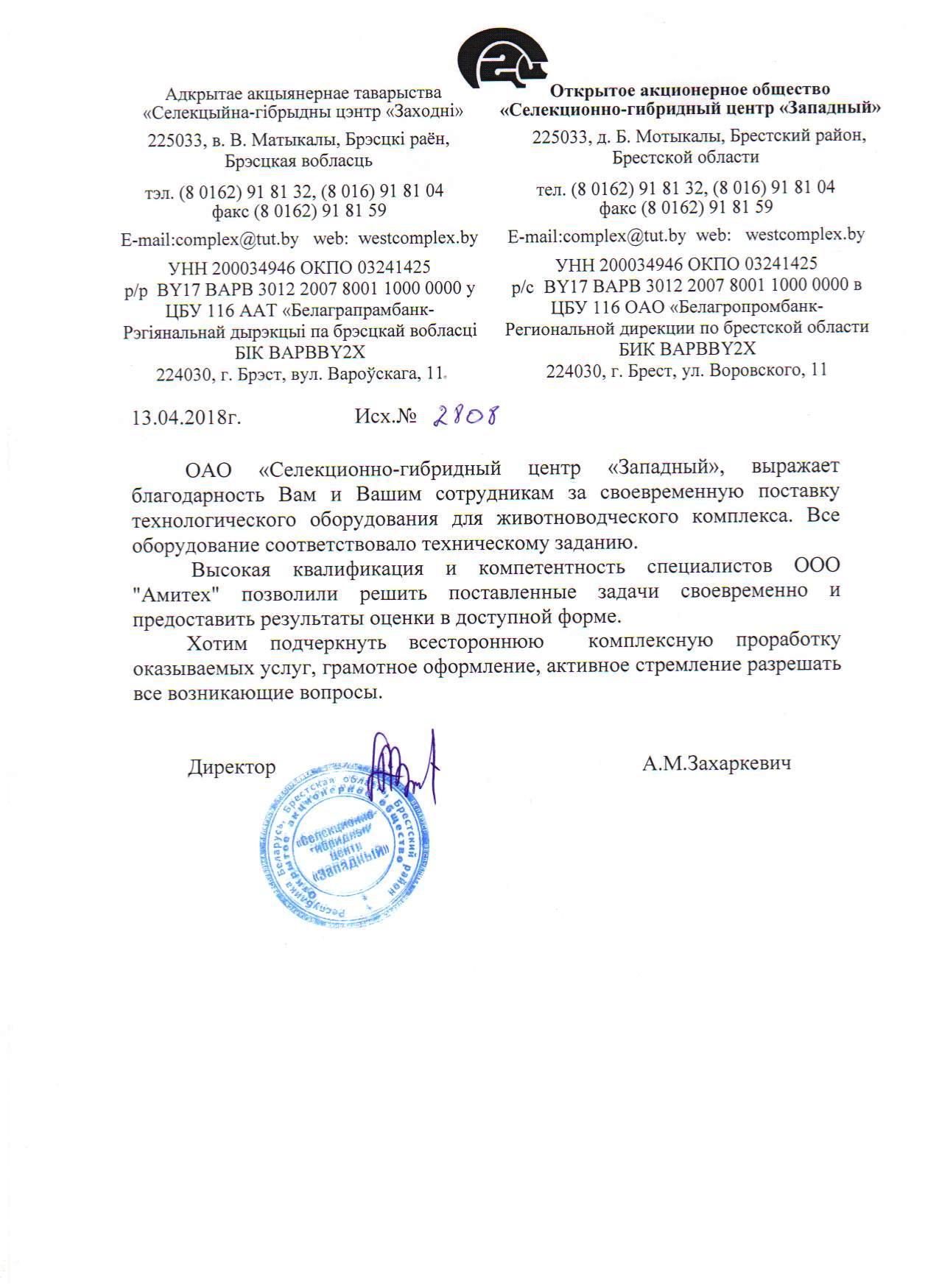 ОАО "Селекционно-гибридный центр "Западный", выражает благодарность Вам и Вашим сотрудникам за своевременную поставку технологического оборудования для животноводческого комплекса. Все оборудование соответствовало техническому заданию.